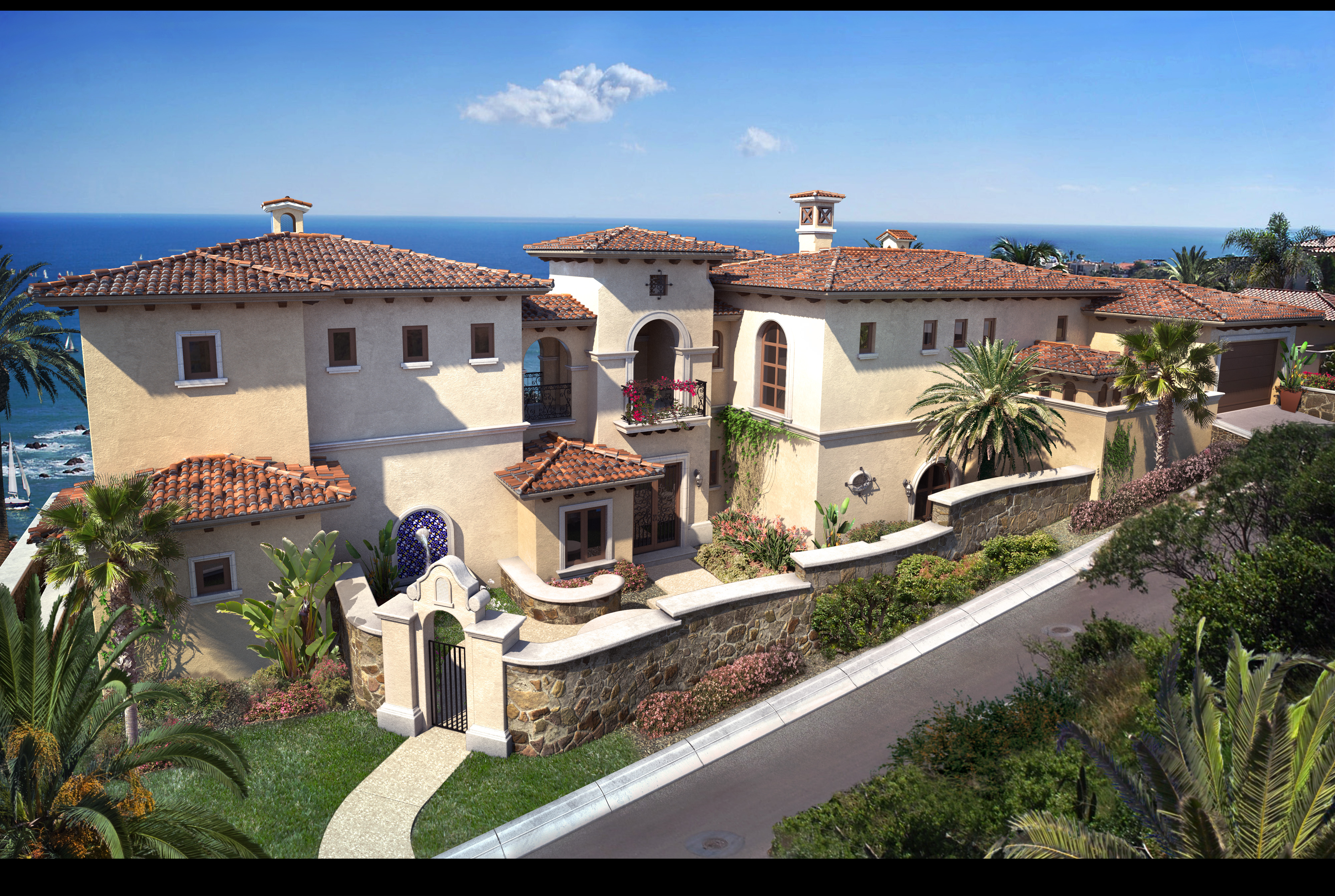 Enter through a wrought iron gate and step down into a lush entry courtyard as the sounds of a cascading fountain welcome you home. A grand foyer frames the magnificent ocean view and opens directly to the expansive pool terrace.